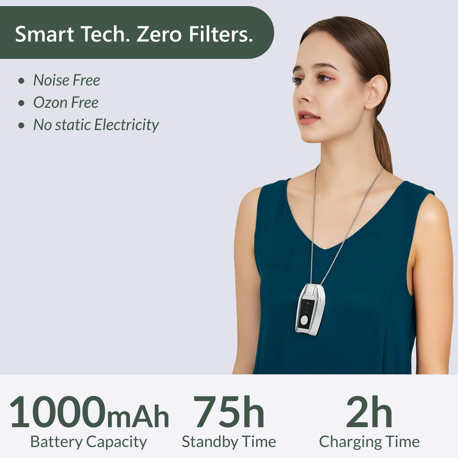 Breathe cleaner air, wherever you go. A compact, wearable air purifier designed to protect your personal breathing zone. Using advanced negative ion technology, it neutralizes airborne pollutants like PM2.5 particles, dust, bacteria, smoke, and smog, giving you cleaner, fresher air in seconds.Perfect for daily commutes, travel, offices, malls, or any crowded environment. Lightweight, stylish, and filter-free- simply wear it, switch it on, and breathe easy.