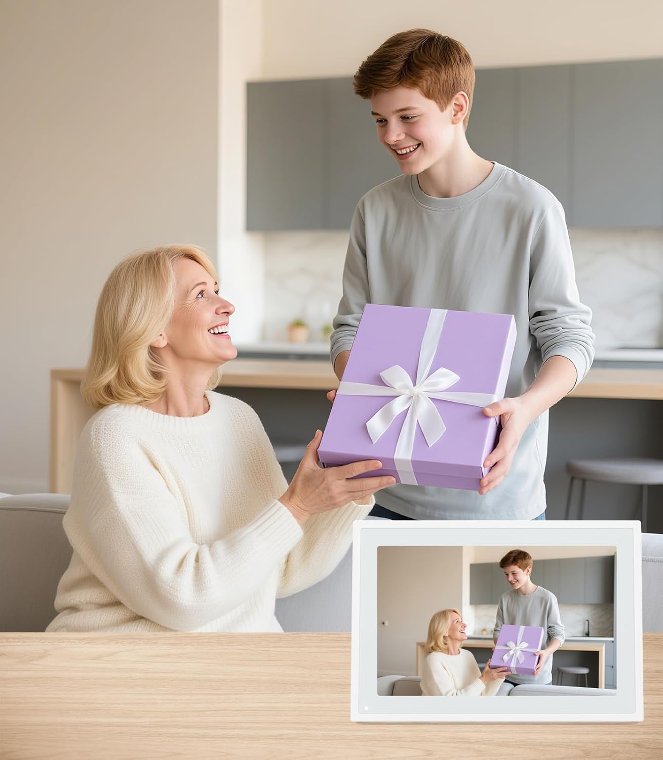 Displays family photos and memories when idle